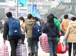 節(jié)前退保的農(nóng)民工紛紛背負(fù)行囊走上了回鄉(xiāng)之旅。 |