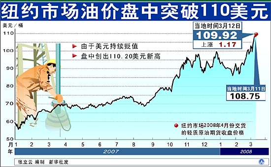 由于市場對西方央行最新注資行動的效果仍存疑慮,加上新數(shù)據(jù)顯示歐元區(qū)經(jīng)濟(jì)基本面穩(wěn)健,12日紐約匯市美元對多數(shù)其他主要貨幣比價回跌,其中對歐元比價再探新低。當(dāng)天紐約匯市尾市時,歐元兌美元比價從前一交易日的1比1.5319升為1比1.5526,盤中曾創(chuàng)下1比1.5559的新高。英鎊兌美元比價從1比2.0029升至1比2.0243。 受美元貶值影響,12日紐約商品交易所4月份交貨的輕質(zhì)原油期貨價格每桶上漲1.17美元,收于109.92美元,盤中最高沖至110.20美元,再次刷新盤中和收盤兩項紀(jì)錄。今年以來,紐約商交所指標(biāo)原油期貨均價達(dá)到每桶95.12美元,比去年初上漲65.5%。倫敦國際石油交易所4月份交貨的北海布倫特原油期貨價格每桶上漲1.02美元,收于106.27美元。 另據(jù)石油輸出國組織(歐佩克)秘書處12日發(fā)布的報告,歐佩克市場監(jiān)督原油一攬子平均價11日達(dá)到了每桶100.57美元。這是歐佩克日平均油價首次沖破每桶100美元大關(guān),在不足兩個半月時間里已9次刷新歷史紀(jì)錄。
