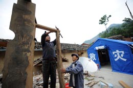 5月21日,隴南市武都區(qū)楓相鄉(xiāng)楓相塬村受災群眾在用從廢墟中揀出來的木頭搭建防震棚。 地震發(fā)生后,甘肅省隴南市武都區(qū)受災群眾在政府和社會各界的幫助下,積極展開生產(chǎn)自救,清掃廢墟,重建家園。新華社記者:聶建江