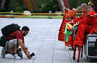 | 一名外國(guó)記者在天安門廣場(chǎng)采訪群眾文藝演出。新華社記者 高學(xué)余
