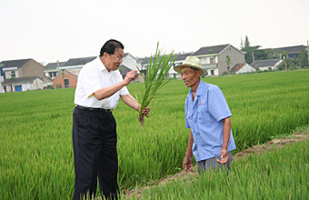 吳仁寶在華西村萬畝農(nóng)業(yè)示范園與村民交流種植技術(shù)。 |