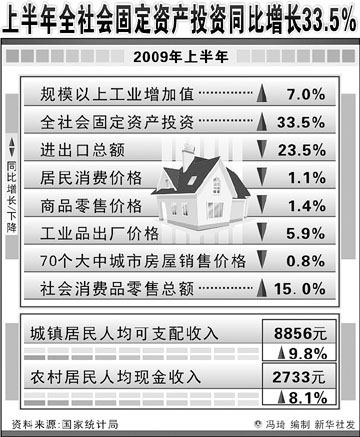 “一個加快”,國內(nèi)需求增長加快。李曉超說,擴大內(nèi)需是經(jīng)濟企穩(wěn)回升的動力和抓手。今年上半年,全社會固定資產(chǎn)投資同比增長33.5%,比一季度加快4.7個百分點,上半年社會消費品零售總額增長15%,而且內(nèi)需增長中有兩個較為突出的亮點,即商品房銷售增長明顯,汽車銷售增長較快,分別增長31.7%和17.7%。