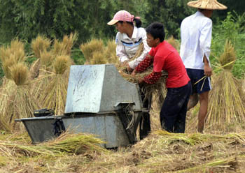 8月7日,柳江縣成團(tuán)鎮(zhèn)甘塘村農(nóng)民給早稻脫粒。新華社發(fā)(賴柳生