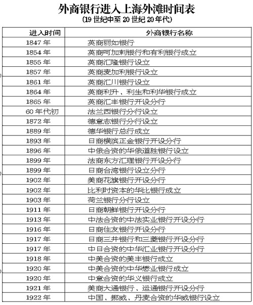 高樓大廈林立的上海外灘,是鴉片戰(zhàn)爭以來外資進(jìn)入的一個(gè)縮影,在這塊彈丸之地上幾乎集中了上海所有的外資銀行,故而當(dāng)時(shí)將外資銀行稱作“外灘銀行”。 外資銀行很早就進(jìn)入了上海,與此相比,華資銀行的產(chǎn)生則整整晚了半個(gè)世紀(jì)。鴉片戰(zhàn)爭后,依據(jù)不平等的《中英南京條約》,上海等五個(gè)東南沿海城市被辟為通商口岸。上海開埠后的第四年即1847年,英商麗如銀行率先搶灘上海。在隨后的70多年中,以英國資本為主導(dǎo),包括法國、德國、日本、俄國、美國等國資本在內(nèi)的30余家銀行陸續(xù)在上海登陸(詳見外商銀行進(jìn)入上海外灘時(shí)間表)。 這些銀行主要集中在從延安東路外灘到北京東路外灘,形成了上海的金融中心。各銀行為了顯示資本的雄厚,都在建筑外觀上追求各自獨(dú)特的風(fēng)格,有哥特式、巴洛克式、羅馬式、中西合璧式等等。 由于外灘附近匯集了各國頗具實(shí)力的銀行,比如英國匯豐銀行、德國德華銀行、美國華旗銀行等,使外灘成為名副其實(shí)的“東方華爾街”。