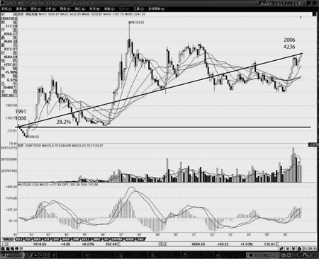 圖4深成指1991年-2006年的實(shí)際走勢 圖4深成指15年的走勢(1991-2006)