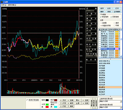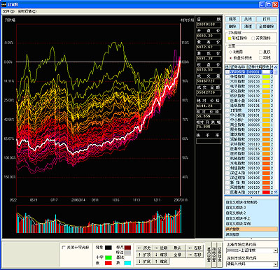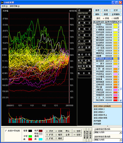當(dāng)用戶選擇若干股票或調(diào)入某個(gè)板塊的一批股票,軟件就會(huì)自動(dòng)對每個(gè)股票計(jì)算彩虹值,并根據(jù)彩虹值自動(dòng)排序。用戶可以從上到下直觀地了解這批股票的"冷暖度",從右邊股票的隊(duì)列中找到感興趣的股票,掌握它的階段特征和在同板塊中的位置。 通過板塊的管理功能(保存,刪除自定義板塊,自動(dòng)選股生成板塊,導(dǎo)入板塊等),對批量的股票做直觀的分析。 特別地,將基準(zhǔn)日定位在歷史某日后,軟件以基準(zhǔn)日自動(dòng)重算彩虹值,再通過對當(dāng)日相對股票的排序,用戶立刻可以看到基準(zhǔn)日時(shí)標(biāo)記階段顏色的股票當(dāng)日的不同表現(xiàn)的表現(xiàn)(升跌幅)。