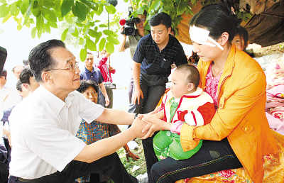 五月十五日,中共中央政治局常委、國(guó)務(wù)院總理溫家寶輾轉(zhuǎn)趕到位于四川北部的青川縣木魚(yú)鎮(zhèn)看望受災(zāi)群眾。這是溫家寶在木魚(yú)鎮(zhèn)文武村安慰在地震中幸存的母子。 新華社記者 姚大偉攝