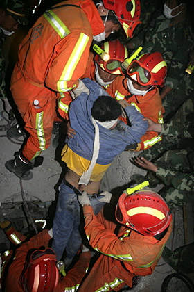 下午我們偶然發(fā)現(xiàn)縣委大樓底下還有生者,就集中力量救援,我們的生命探測(cè)儀發(fā)揮了重要作用,很快就確定了被救者的位置。幸存者是這個(gè)縣的政法委書記,由于他長(zhǎng)期在黑暗中見不到亮光,我們就一直用毛巾捂著他的眼睛,而他執(zhí)意要拿開我們放在他臉上的手巾,說(shuō)要看我們一眼。我們告訴他,你不能看,見到光后你可能失明。他說(shuō),就是失明也要看看是誰(shuí)救了我,我們堅(jiān)決不讓。他的眼睛保住了。我們真的很開心。 晚上回來(lái)的時(shí)候,吃上了方便面和大米粥,而且今天清水也送來(lái)了。大家4天來(lái)終于可以洗一次臉了。