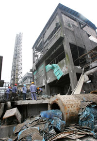 積極自救,恢復(fù)生產(chǎn)。5月24日,在四川什邡市鎣華鎮(zhèn)鎣峰實(shí)業(yè)有限公司內(nèi),工人們在清理毀壞的廠房。新華社發(fā)(戚振林