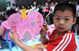 6月1日,參加活動(dòng)的小朋友在展示自己繪制的祈?ā.(dāng)日,中國(guó)人壽天津市分公司與天津市青少年活動(dòng)中心共同舉辦“真情六一、祈福災(zāi)區(qū)”主題公益活動(dòng)。來自天津各區(qū)縣的150多名少年兒童代表參加活動(dòng),表達(dá)對(duì)災(zāi)區(qū)小伙伴的節(jié)日祝福。新華社記者:劉海峰 攝