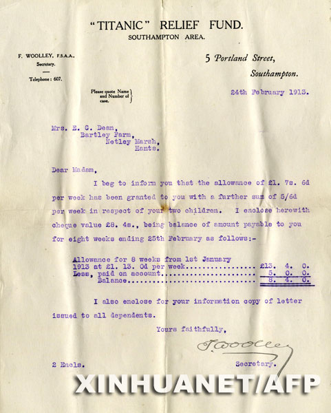 這張由亨利·奧爾德里奇父子拍賣(mài)行發(fā)布的照片顯示的是“泰坦尼克”號(hào)救濟(jì)基金會(huì)寄給米莉維娜·迪恩的賠償信。
