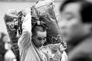 | 11月23日,一名返鄉(xiāng)的農(nóng)民工肩扛行李走出安徽阜陽(yáng)火車站。安徽省要求各地建立農(nóng)民工返鄉(xiāng)旬報(bào)制度。新華社發(fā) |