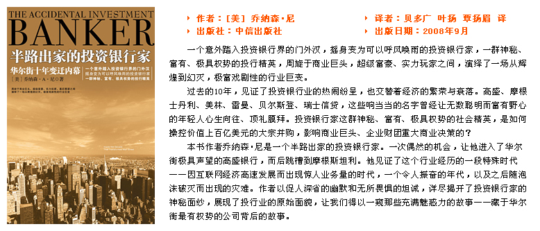 本書作者喬納森?尼通過一個業(yè)內(nèi)人的視角,以風趣而不失嚴謹?shù)墓P調(diào),詳盡記錄了投資銀行業(yè)十幾年來的變遷,描繪了形形色色的人物形象,揭開了投資銀行家這群社會精英的神秘面紗,是迄今為止國內(nèi)出版的有關投行業(yè)的書籍中,難得一件的佳作!